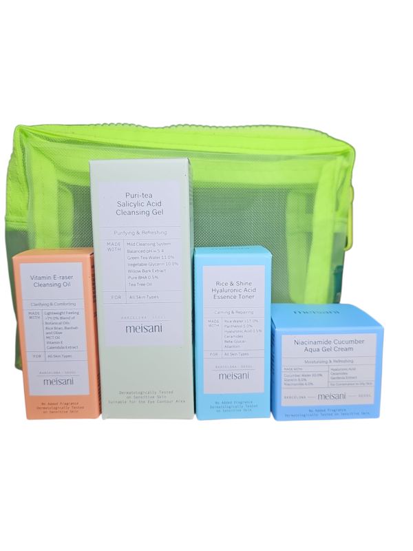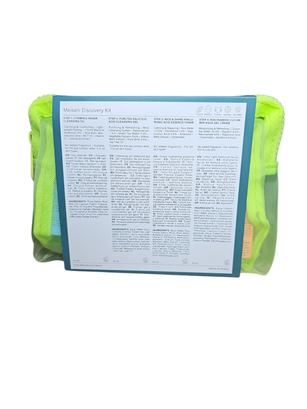 Le Discovery Kit de Meisani est la solution parfaite pour celles et ceux qui souhaitent tester une routine coréenne complète, efficace et minimaliste. Regroupant les best-sellers de la marque dans une trousse néon tendance, ce kit offre tout le nécessaire pour nettoyer, hydrater et illuminer la peau, où que vous soyez.